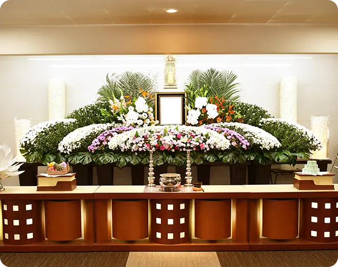 家族葬でも豪華な祭壇で故人を送りたい。そんなご要望にお応えするのがメモリア・プレミアムです。故人がお好きだった花、故人と縁のある花など、お別れの時を優美に彩ります。